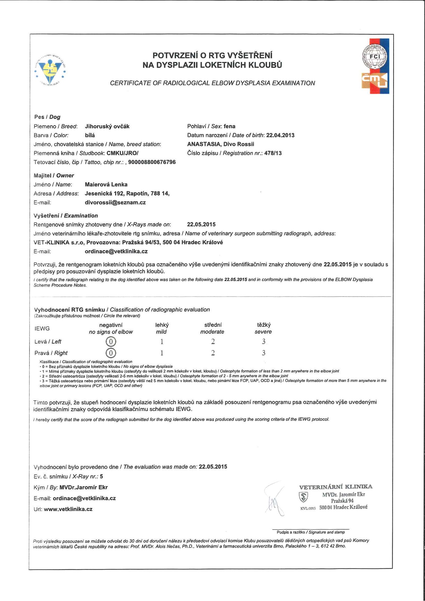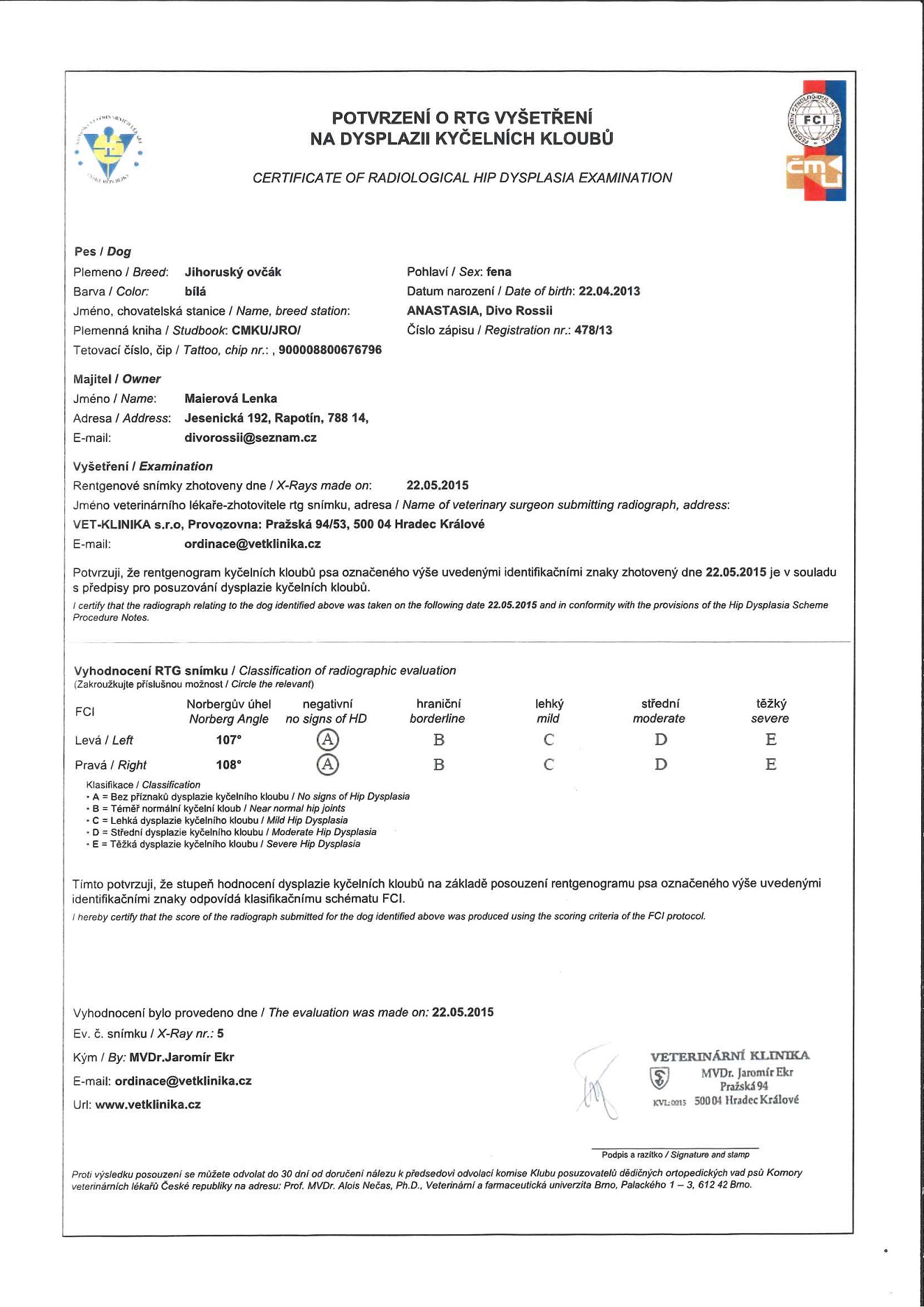 matka // mother: ANASTASIA Divo Rossii (RTG DKK 0/0, DLK 0/0 // HD-A, ED-A)