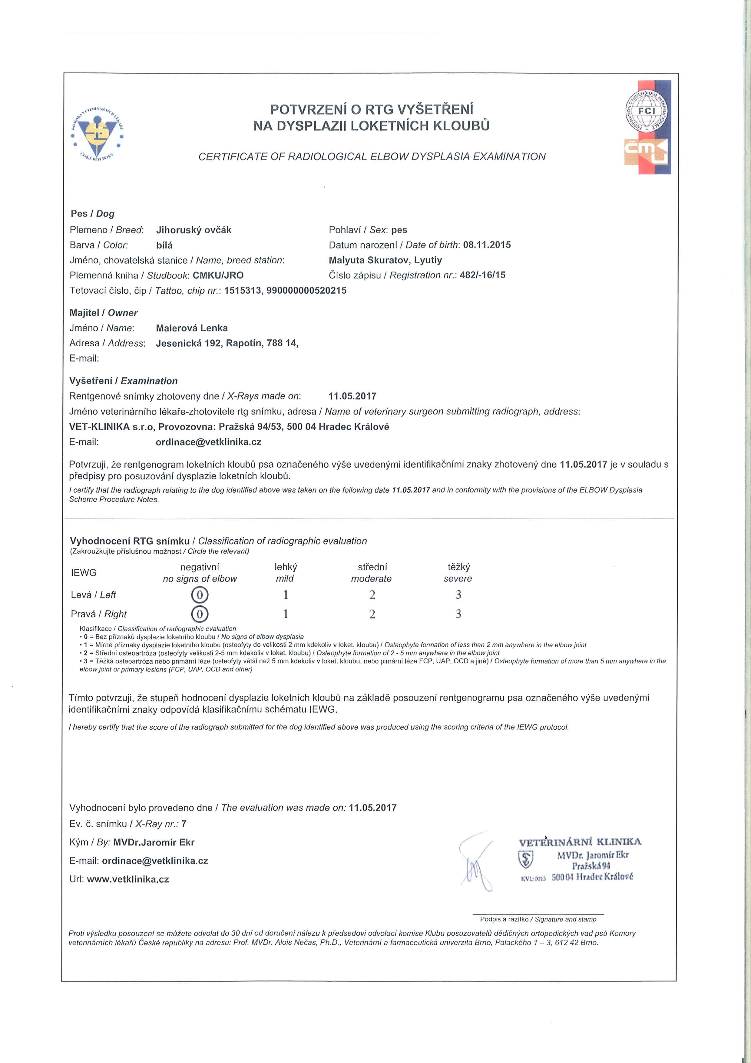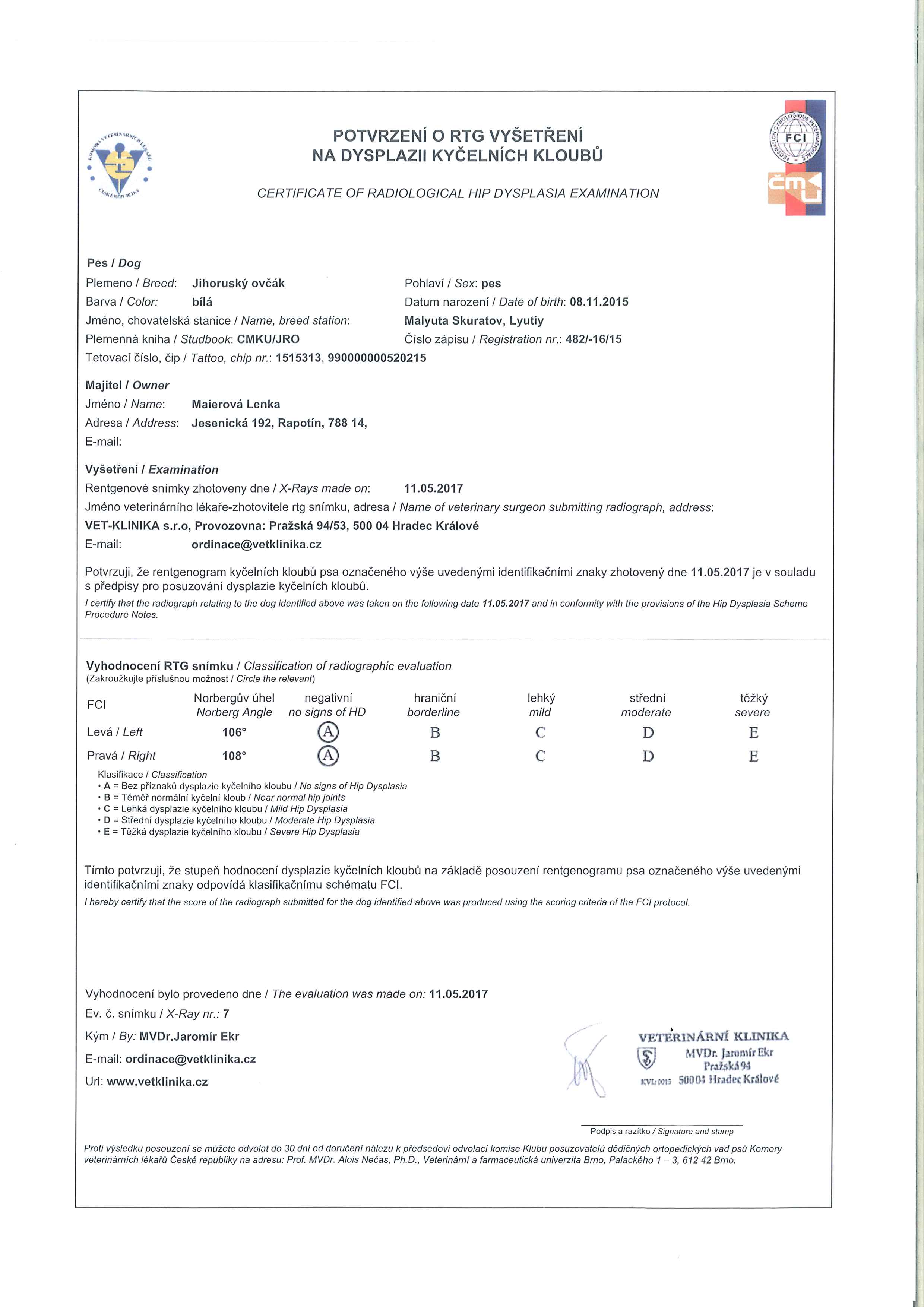 Winner special show KRaAOP 2017, Young Club winner JUZAK 2017, Young winner special show KRaAOP 2016, 2x CAJC (SK,CZ), BOJ, CAC, BOS MALYUTA SKURATOV Lyutiy /UA/ Белый, 2015 HD - A // ED - A